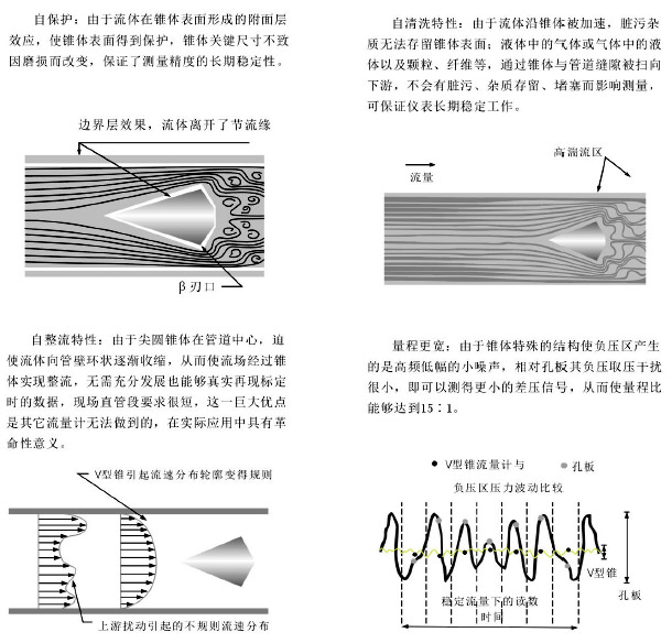 V形錐節(jié)流裝置是一種全新的差壓式流量計(jì)量裝置,它以獨(dú)特的邊壁逐漸收縮節(jié)流方式,一改傳統(tǒng)節(jié)流裝置的幾乎所有缺點(diǎn),是差壓式流量計(jì)革命性成果。其原理與其他差壓式流量計(jì)一樣,是經(jīng)典的密閉管道中能量守恒原理和流動(dòng)連續(xù)性原理,并具有自整流、自清洗、自保護(hù)性能;直管段要求極短,無(wú)積污、堵塞,可保持長(zhǎng)期測(cè)量穩(wěn)定;錐體后端高頻低幅的小噪聲下限相對(duì)很低,從而使量程比達(dá)15:1;其永久壓損只及孔板的1/3和文丘里管相似。因此,可廣泛應(yīng)用于石油、化工、電力、供熱等國(guó)民經(jīng)濟(jì)各領(lǐng)域。