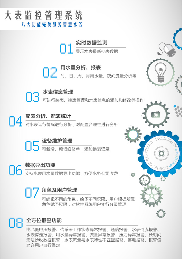 大表數(shù)據(jù)遠程監(jiān)控管理分析平臺采用WEB開發(fā)標(biāo)準(zhǔn),支持聯(lián)網(wǎng)上線,只有能夠連接網(wǎng)絡(luò),就能訪問系統(tǒng)平臺,管理系統(tǒng)多種功能,為使用者提供方便快捷的可移動管理途徑,可提高工作效率,減少費用,迎合現(xiàn)代資源管理的發(fā)展需求。系統(tǒng)基于B/S的結(jié)構(gòu)設(shè)計,擺脫了傳統(tǒng)C/S結(jié)構(gòu)系統(tǒng)實施、維護工作復(fù)雜的缺點,實現(xiàn)系統(tǒng)集中維護,全面升級,為用戶提供一個方便快捷的管理平臺。用戶在現(xiàn)場安裝好水表后,用戶只需要打開網(wǎng)絡(luò)瀏覽器,登錄抄表系統(tǒng),建立好水表檔案,就可以遠程的管理和抄取水表數(shù)據(jù)。
